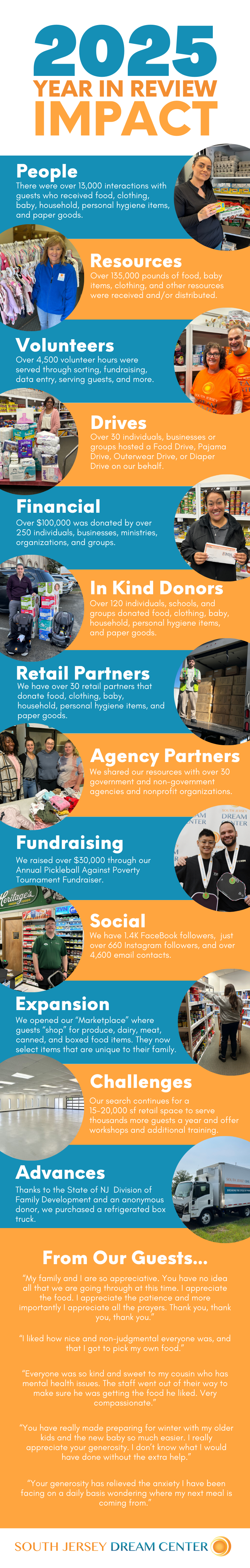 The South Jersey Dream Center is a 501(c)(3) non-profit corporation, all financial gifts are tax deductible, and a receipt for your contribution will be provided for your records. EIN# 46-3760076